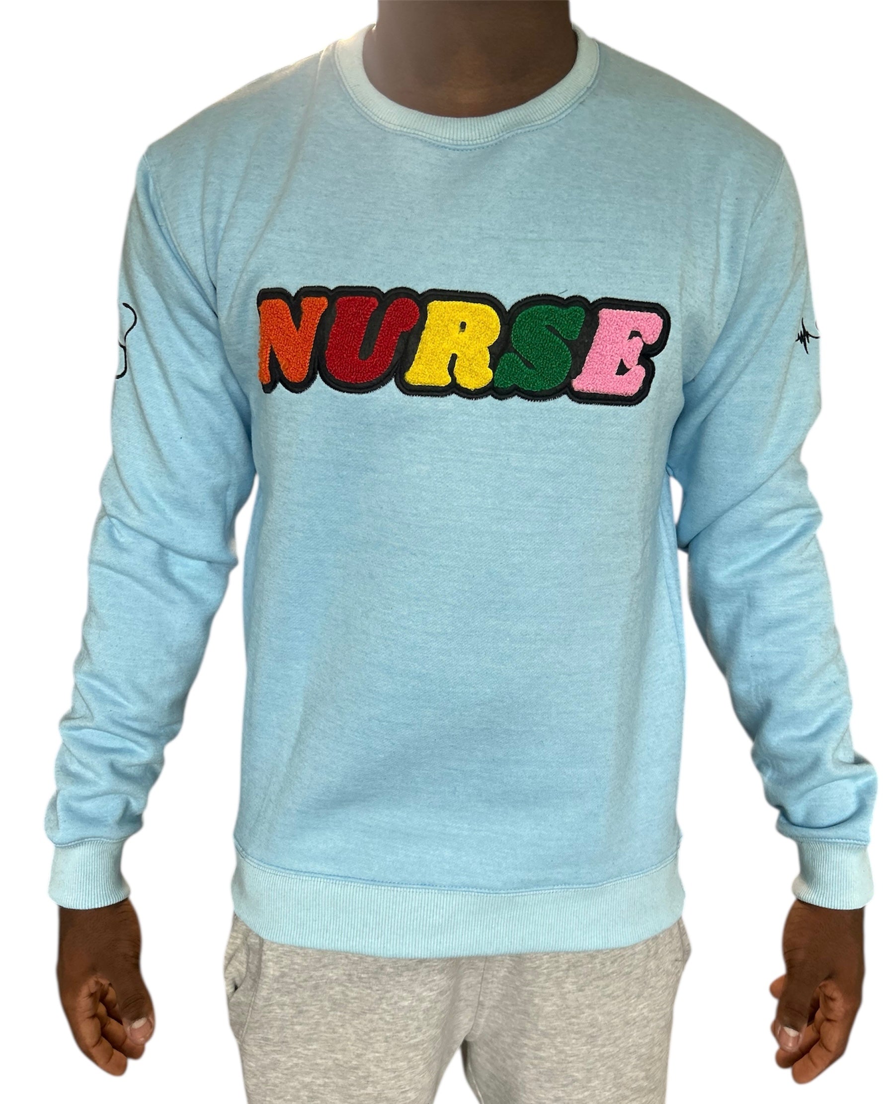 This oneβs for the nurses who bring calm into chaos. Baby blue, buttery soft, and thick enough to keep you warm without overheating mid-code. Itβs the βI care, but Iβm also cool AFβ sweater. Oversized chenille βNURSEβ patch reminds everyone who the real MVP isβeven when you're off duty.