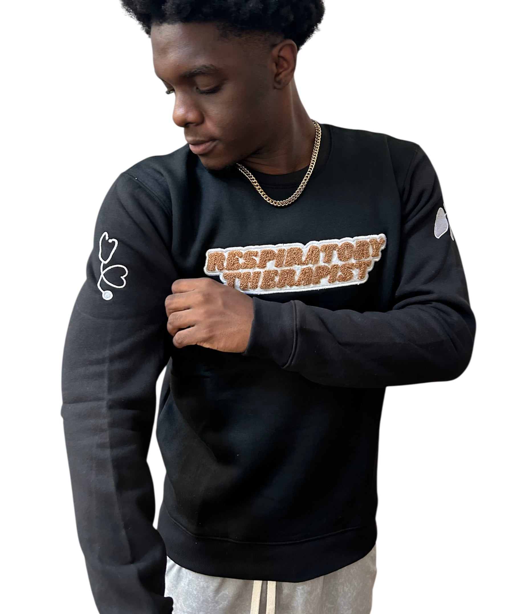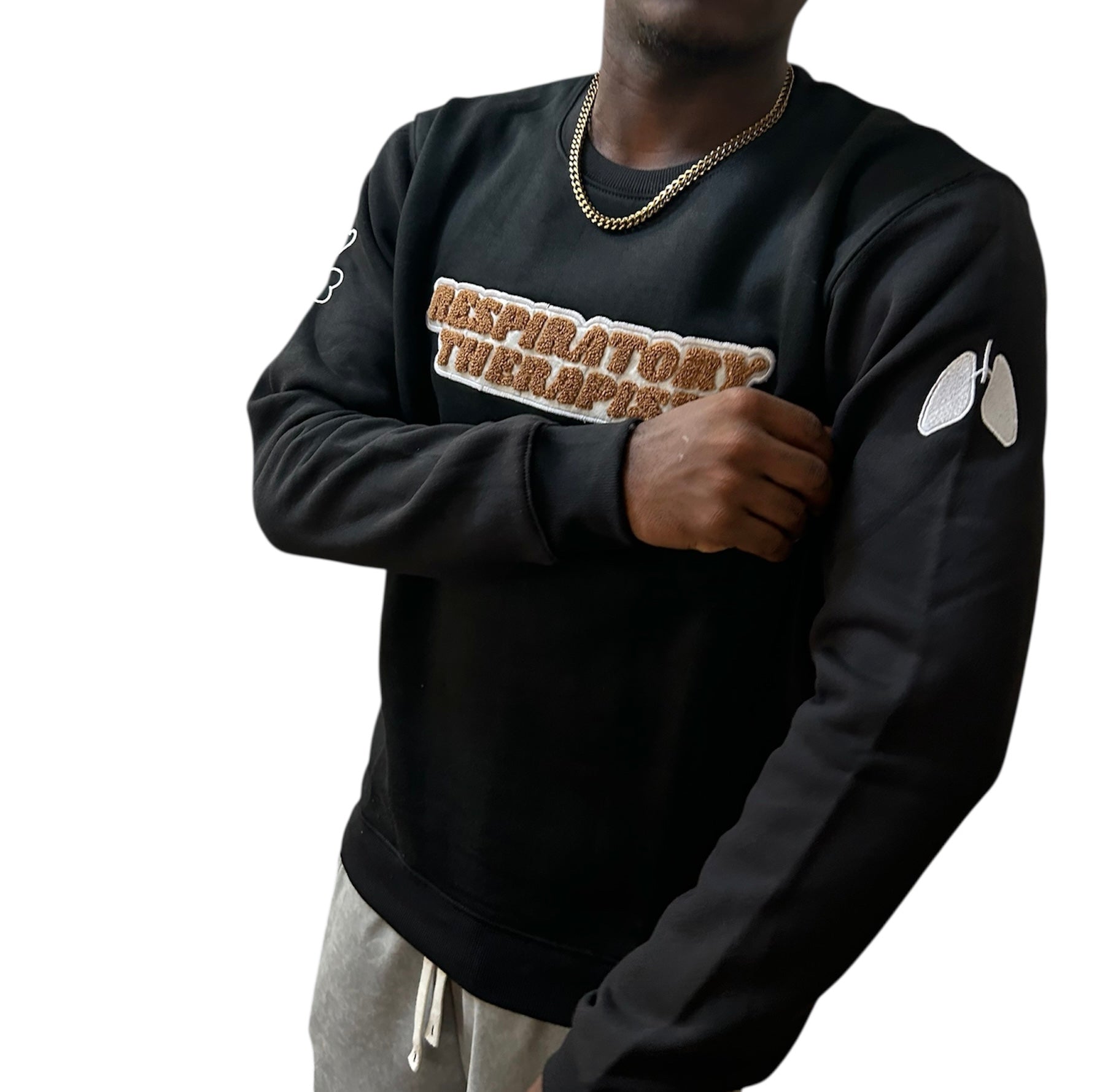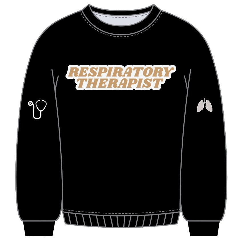 Across the chest, Respiratory Therapist is displayed with a sleek design, symbolizing strength and professionalism. The sleeve features a detailed lung graphic—an anatomical reminder of the lifesaving work RTs perform every day.