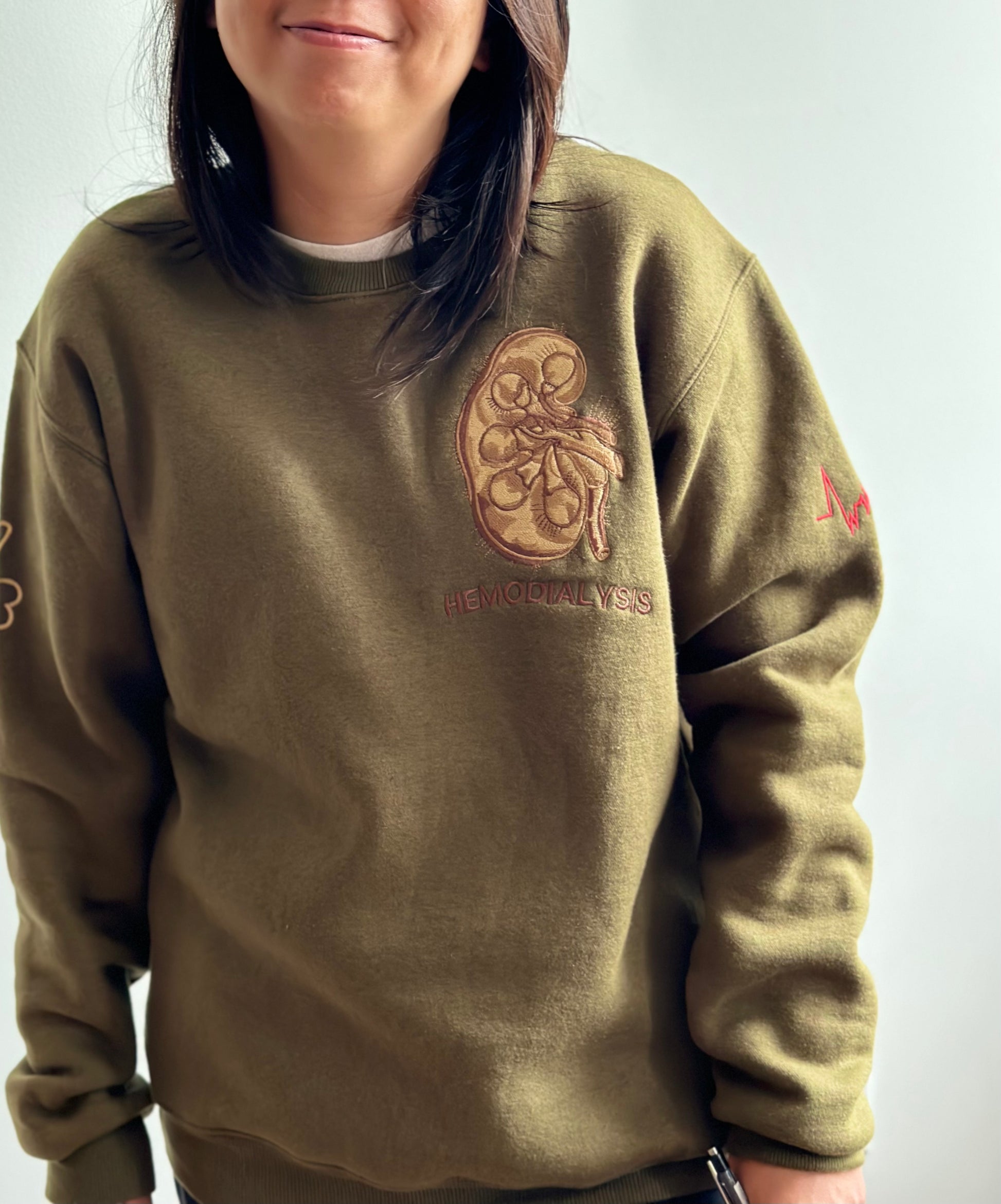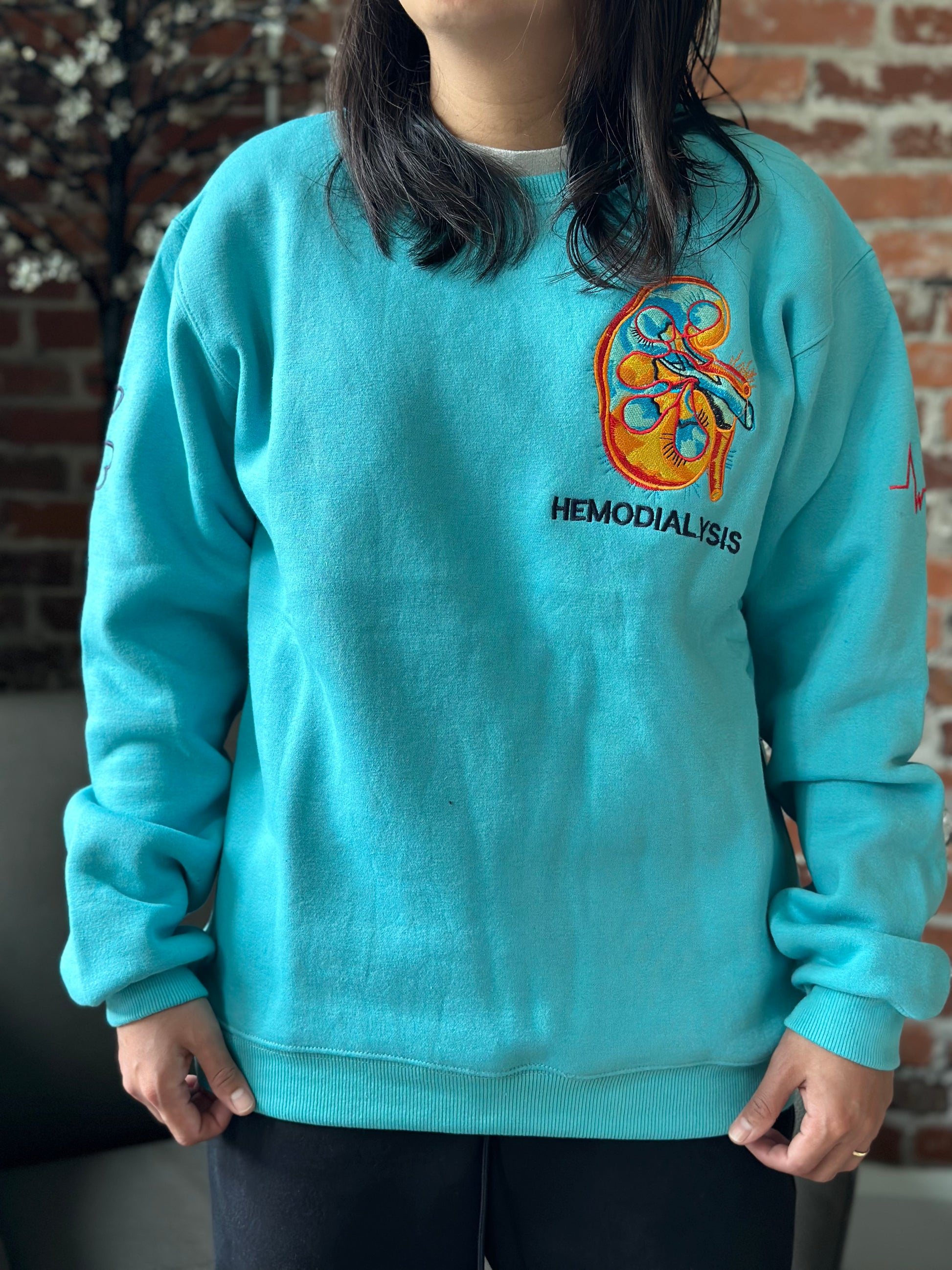 Dialysis life, but make it fashion. This army teal blue crewneck is for the kidney warriors and the lifeline runners—those who live by the machine, the rhythm, and the unspoken strength it takes to do it all again tomorrow. With bold chenille embroidery and custom design details that nod to the grind of hemodialysis, this piece isn’t just comfy—it’s a badge of honor. Thick, soft, and made to move, it’s a go-to layer for long shifts or recovery days. Designed by a nurse who sees you.